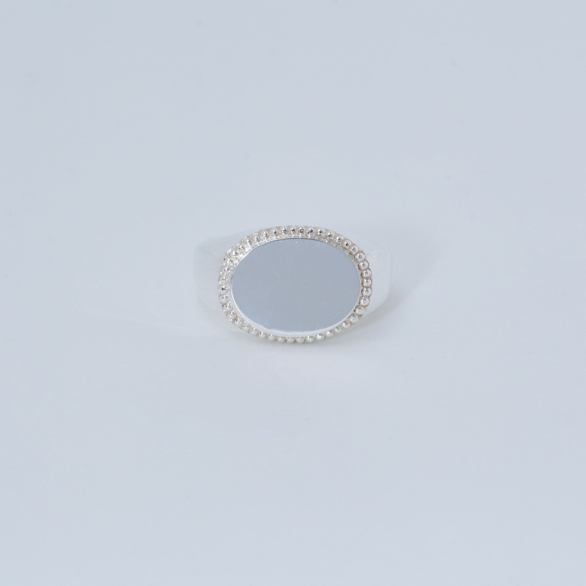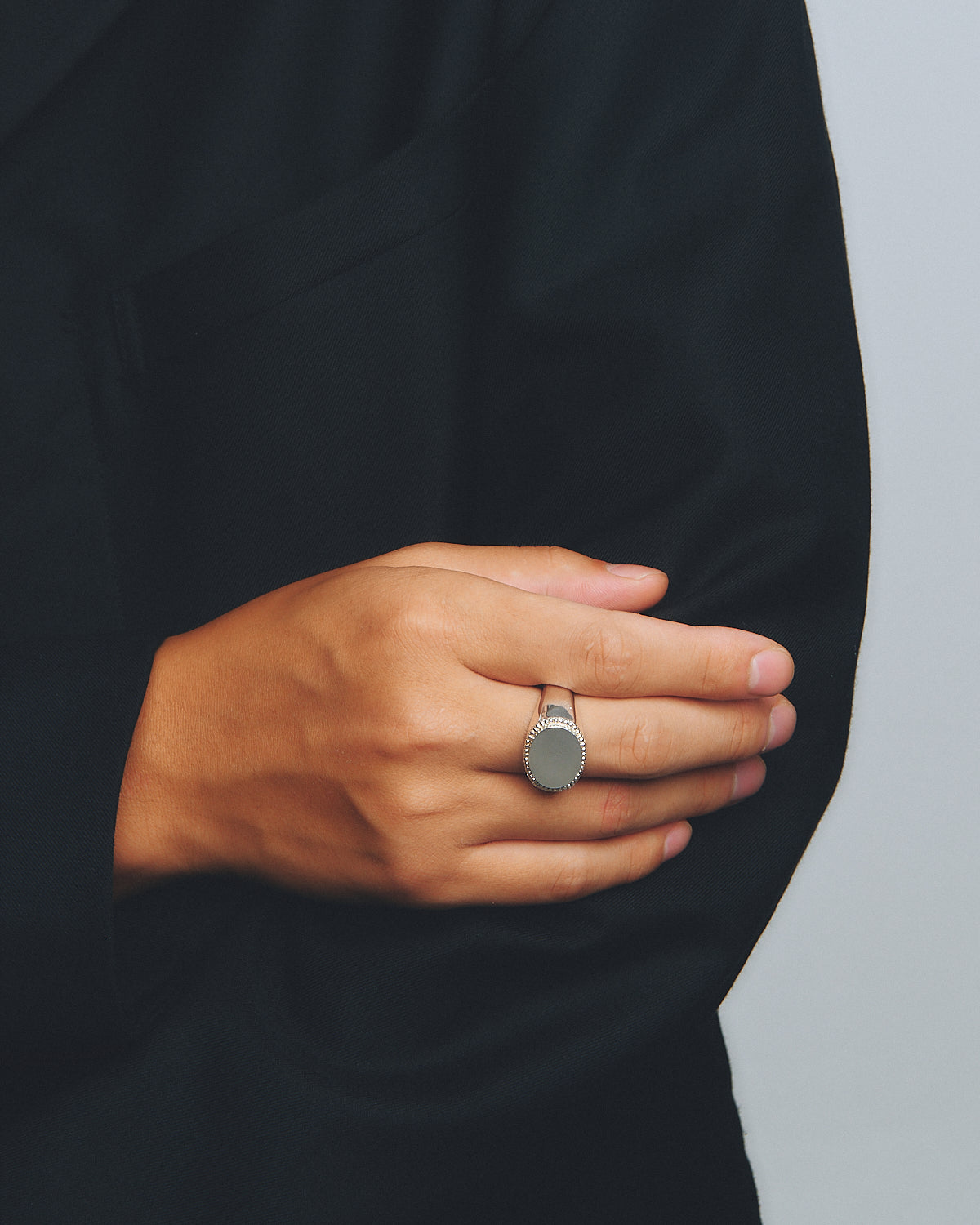 一枚碩大醒目的橢圓形印章戒指,由 925 銀製成,飾有滾壓紋飾。