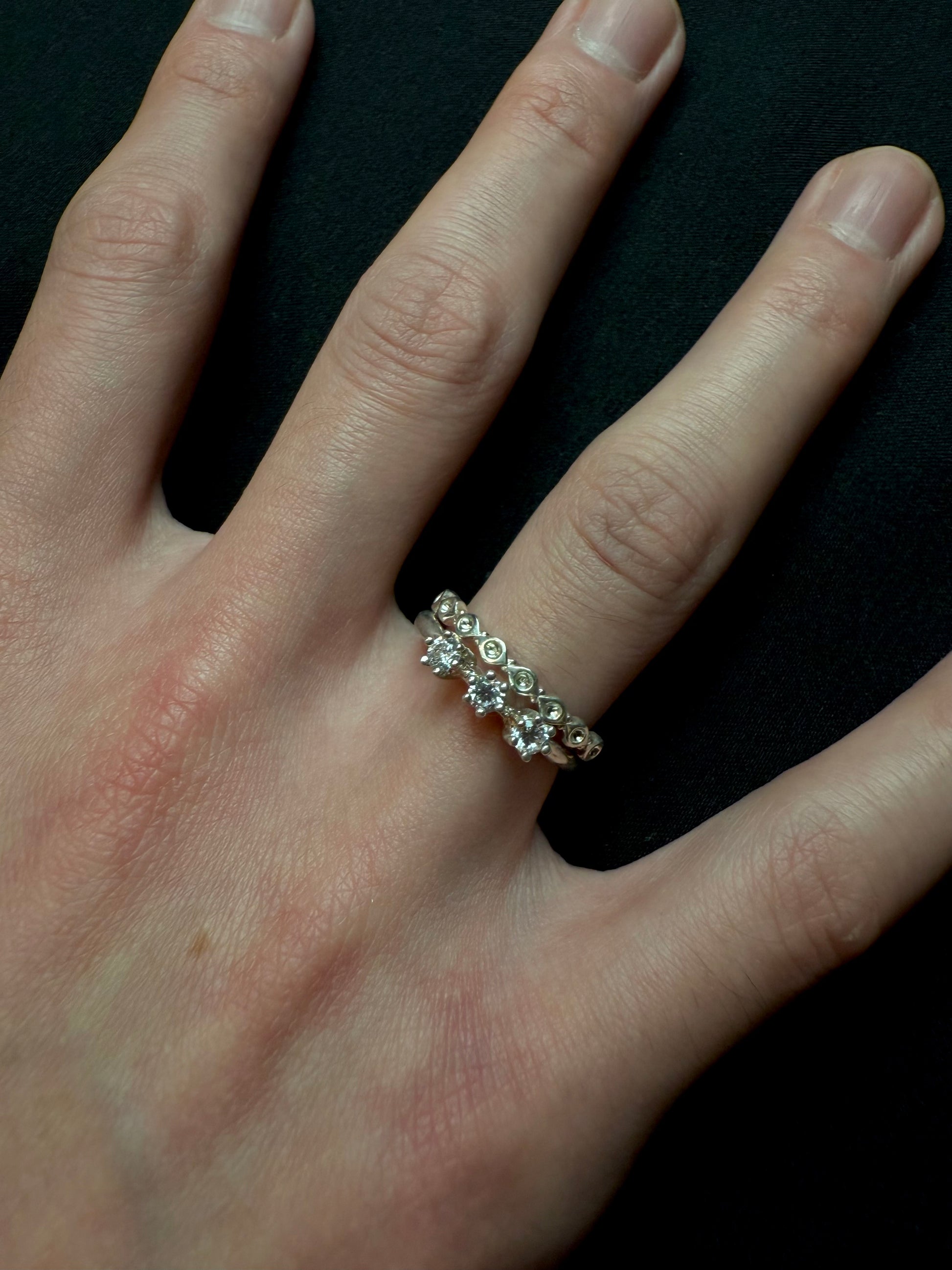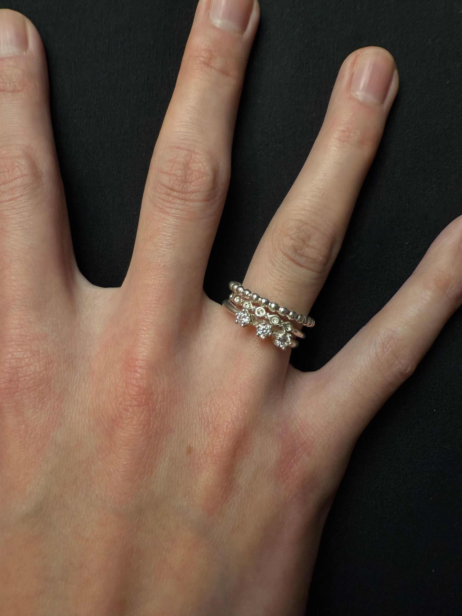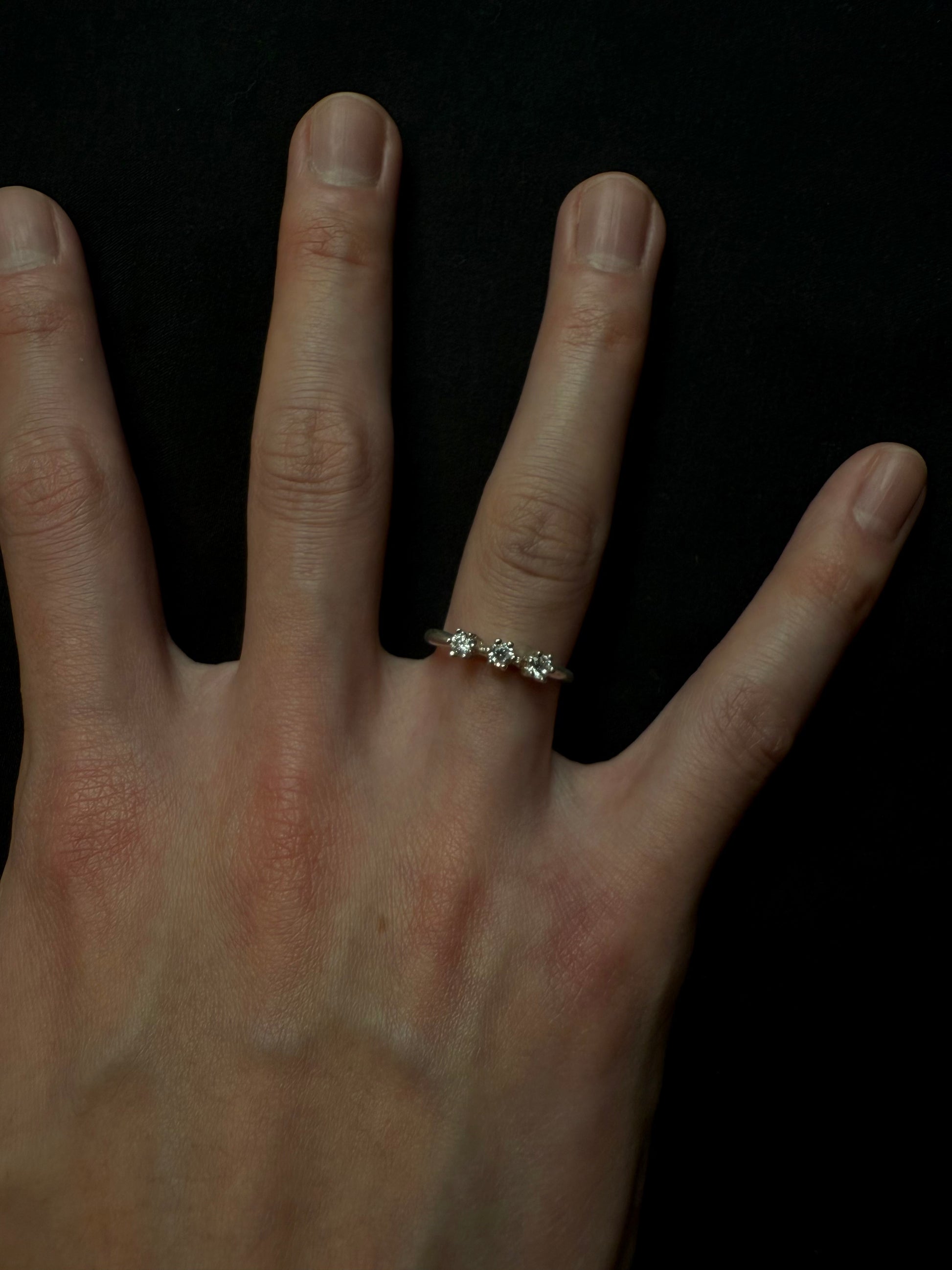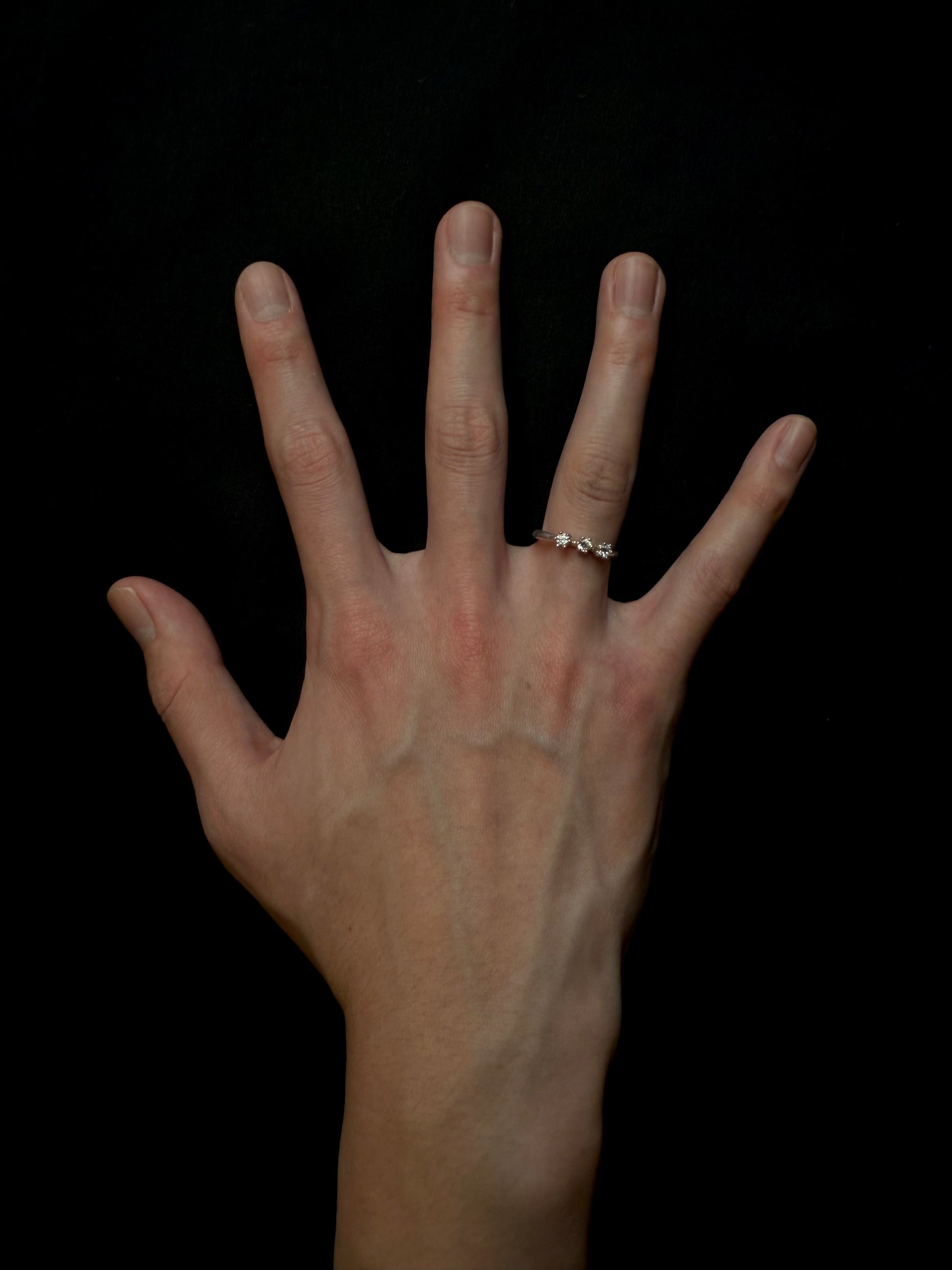 一枚鑲嵌著三顆閃亮寶石的戒指,戴在纖細的臂膀上。