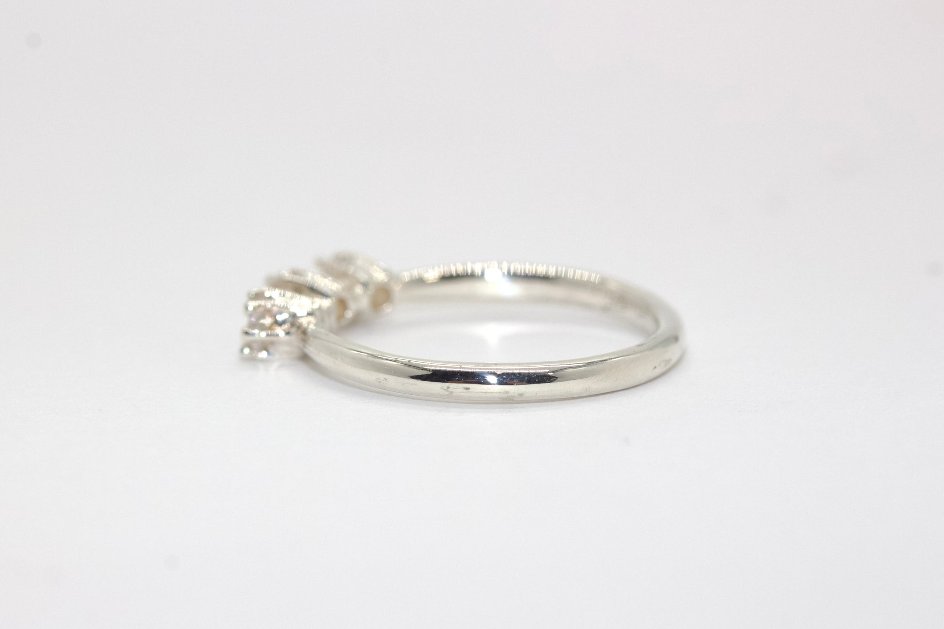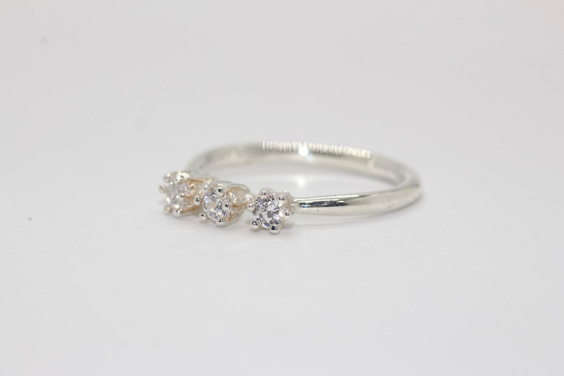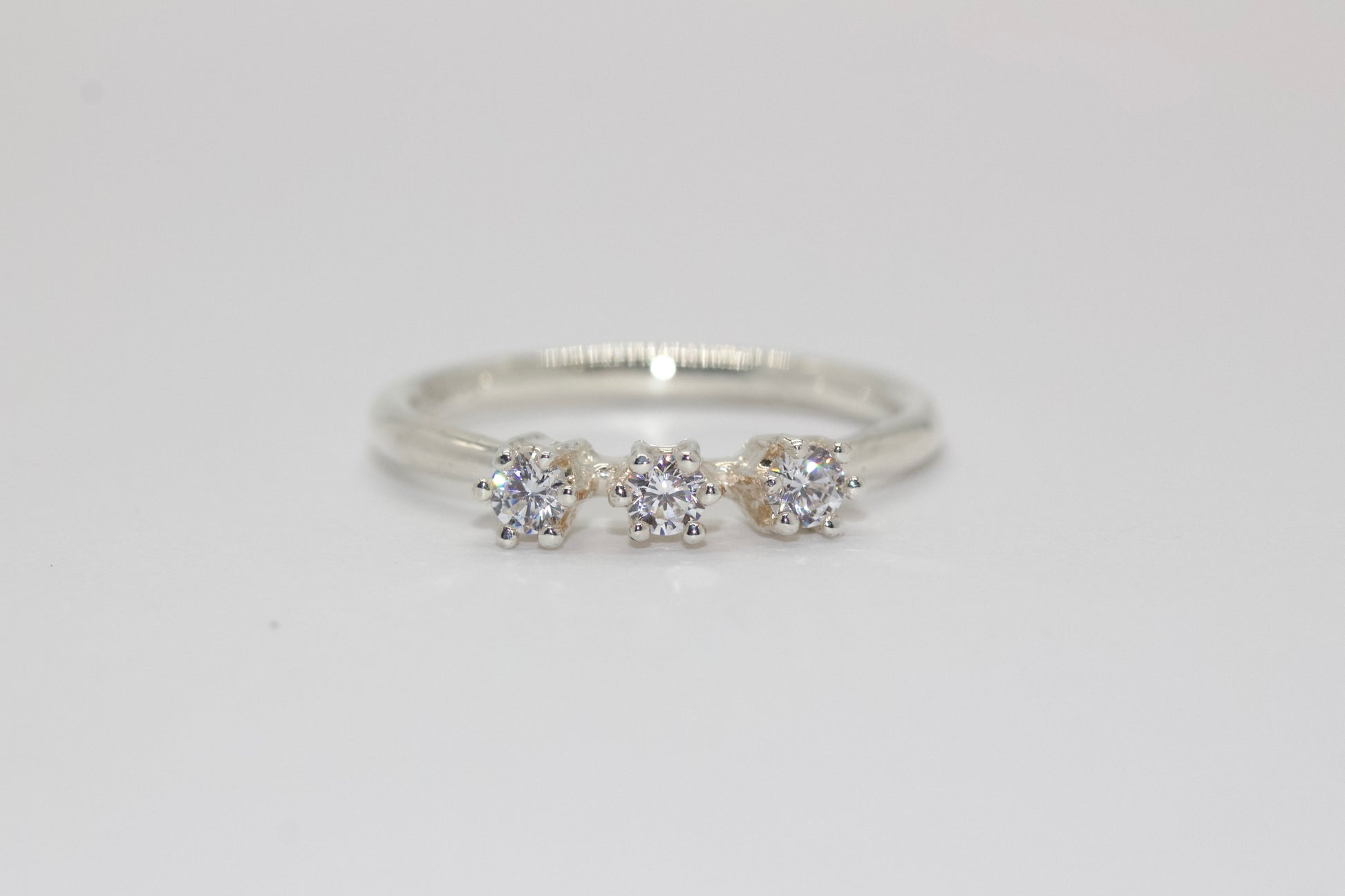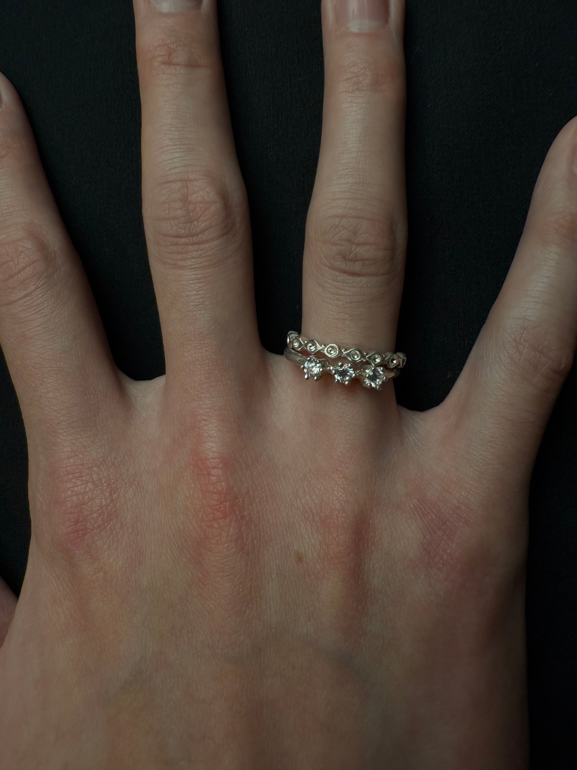 一枚鑲嵌著三顆閃亮寶石的戒指,戴在纖細的臂膀上。
